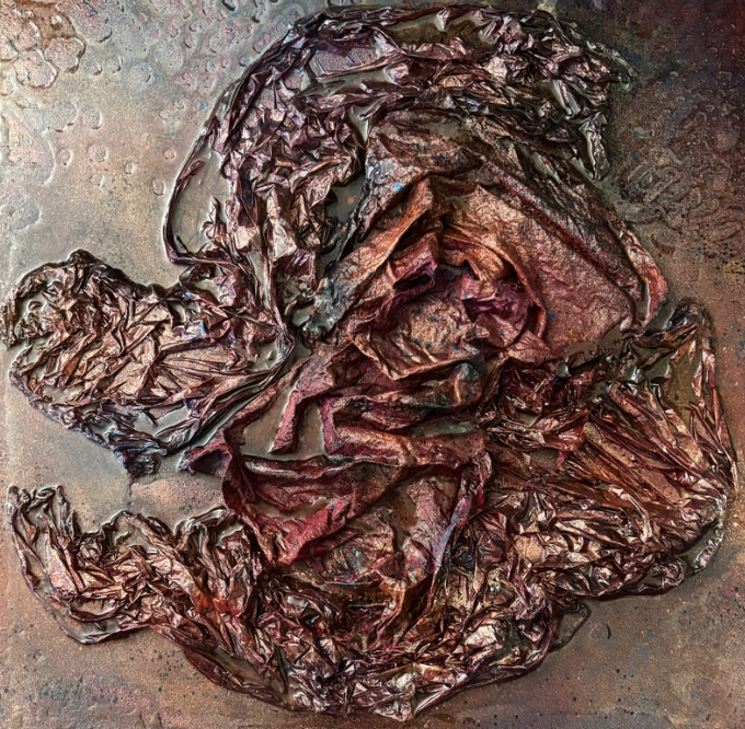 Textures denses, contrastes et jeux de brillance structurent la surface. La résine vient révéler les reliefs et intensifier la présence des formes et des couleurs.